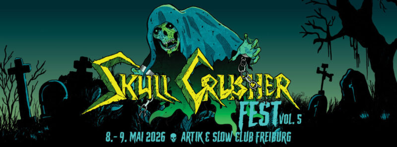 Nach vier ausverkauften Ausgaben des Festivals im Herzen Freiburgs geht das SkullCrusher Fest in seine fünfte Runde! Das ArTik und der Slow Club nutzen ihr nachbarschaftliches Verhältnis ein weiteres Mal und bündeln diese Synergien, um in diesem Fall der vierten Auflage vom SkullCrusher Fest den nötigen Raum zu bieten. Das Indoor-Festival wird wie gehabt in zwei unterschiedlichen Locations stattfinden, die praktisch direkt nebeneinander liegen, genaugenommen sind es keine 200 Schritte zwischen der Eingangstür vom Freizeichen (der Spielstätte des ArTik) bis zur Eingangstür des Slow Clubs. Wie schon bei den vergangenen zwei Ausgaben wird es auch 2026 einen zweiten Festivaltag geben, an dem vier Bands im ArTik spielen werden – quasi der Warm-Up am Freitag – bevor euch am Samstag die gewohnte Vollbedienung mit 13 Bands in beiden Locations erwartet. Das reguläre Ticket beinhaltet beide Festivaltage, es gibt aber auch eine begrenzte Anzahl Tagestickets.