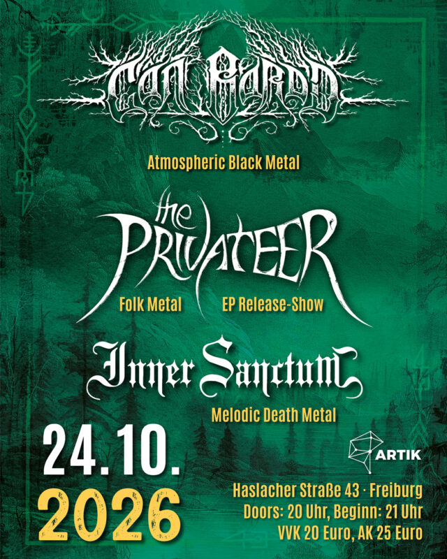 Eröffnen werden den Abend die Freiburger Melodic Death Metal Band Inner Sanctum. Mit ihrem noch immer aktuellen Konzeptalbum „The Great Odd Ones“ tauchen Inner Sanctum in das unheimliche Reich der Meeresgötter ein. Nachdem man auf dem SkullCrusher Fest 2024 den Release des Albums gefeiert hat, schließt sich im Oktober 2026 der Kreis.